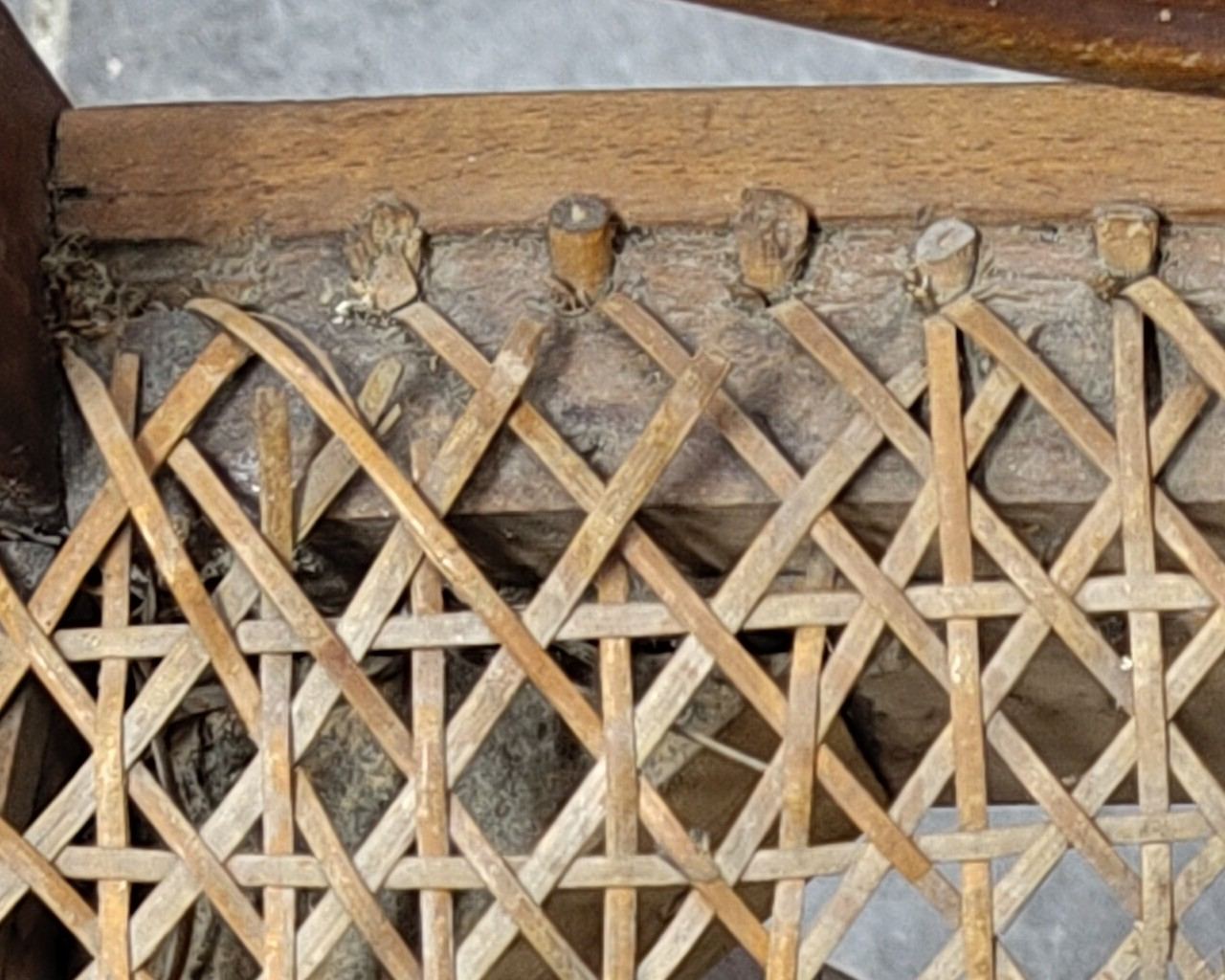 La deuxième chaise est en sensiblement meilleur état. Le cannage du dossier semble être d'origine (ou alors il a été refait dans les règles), mais c'est surtout le placage des traverses de l'assise qui a souffert. Il est complètement parti et perdu sur l'une, fort abîmé sur l'autre.