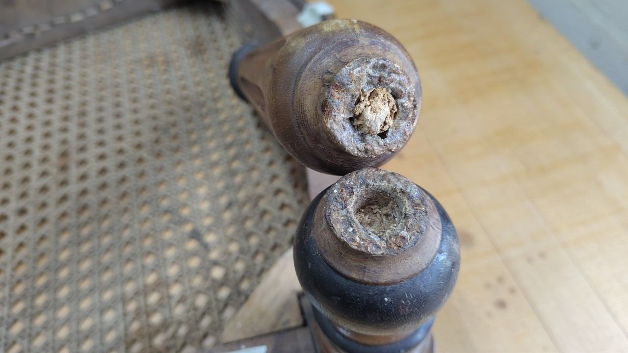 Après discussion avec madame, on décide qu'une seule chaise en état de marche, ce sera très bien ! Je vais donc restaurer la deuxième chaise, celle qui est en meilleur état général, en canibalisant la première en cas de besoin. Je commence donc par démonter cette première chaise pour me faire la main, en espérant que si je fais une erreur, je puisse l'éviter lors du démontage de la deuxième