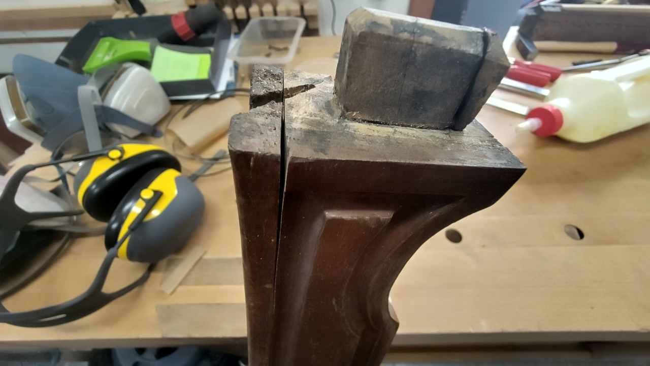 Les tenons, mais surtout les mortaises, ont besoin d'un bon nettoyage pour enlever les résidus de colle ! Pour la face, j'ai appliqué quelques gouttes de vinaigre sur la colle pour la ramollir avant de passer le racloir, ça aide bien (racloir Bahco au carbure et racloir d'ébéniste).