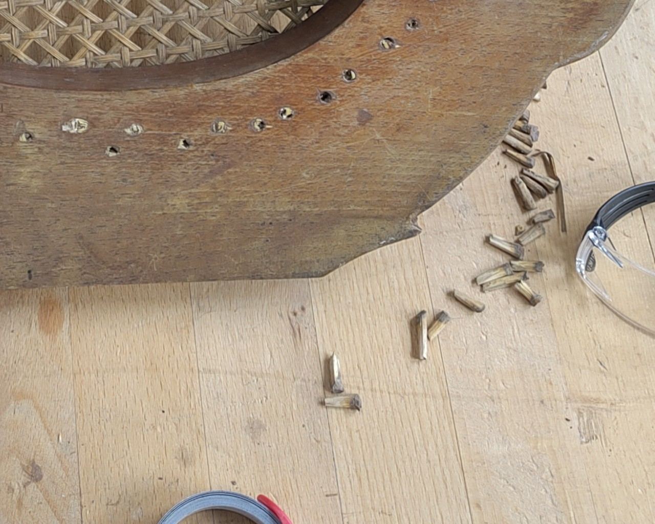 Une fois ces renforts hors du chemin, je peux faire sauter toutes les petites chevilles qui tiennent le cannage en place, en utilisant un chasse-goupille depuis l'intérieur. J'en ai un de 1/8" (environ 3.2mm), ce qui est assez petit pour passer entre les brins de cannage, parfait pour la situation ! (Ne faites pas attention au dossier, c'est bien l'assise que je retire, c'est pour montrer les petites chevilles)