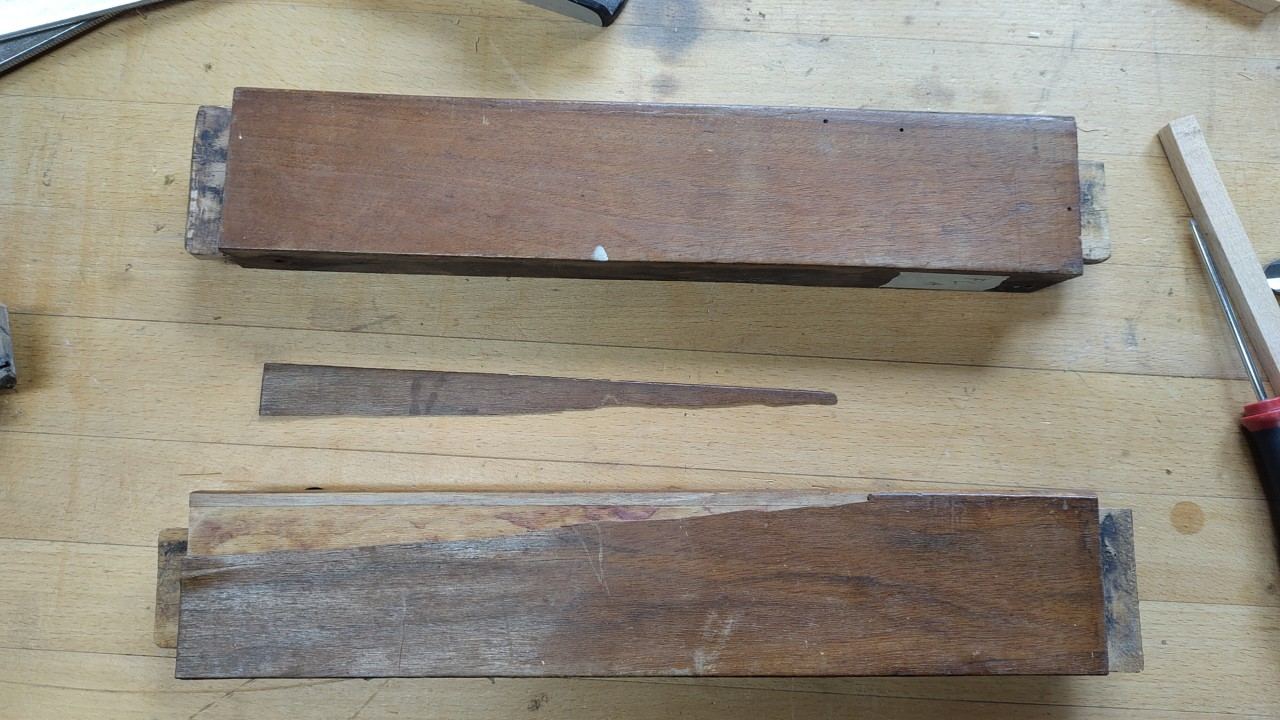 Comme les deux traverses latérales de l'assise de la bonne chaise sont en trop mauvais état, je vais les remplacer par celles de la première chaise. Bon, elles ne sont pas parfaites non plus, mais au moins elles sont réparable, il faut juste recoller le placage. Et c'est maintenant, en voyant cette photo, que je me dis que je suis parfois un peu idiot