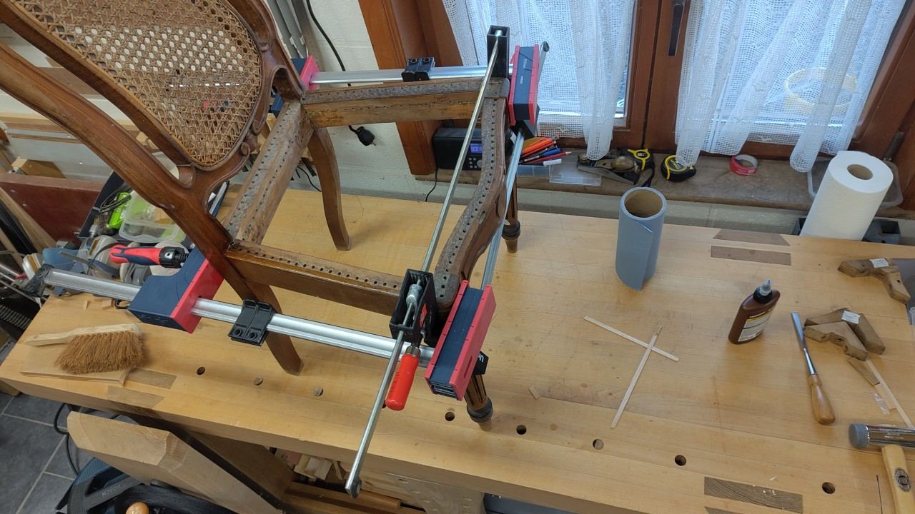 Vient enfin le moment où je vais pouvoir réassembler la chaise. Je prépare bien mon chantier, même s'il n'y a rien de spécialement compliqué. C'est la première fois que j'utilise la colle forte d'ébéniste, mais j'avoue que je ne me suis même pas lancé dans la colle chaude, j'ai choisi la facilité avec la Titebond "Genuine Hide Glue"