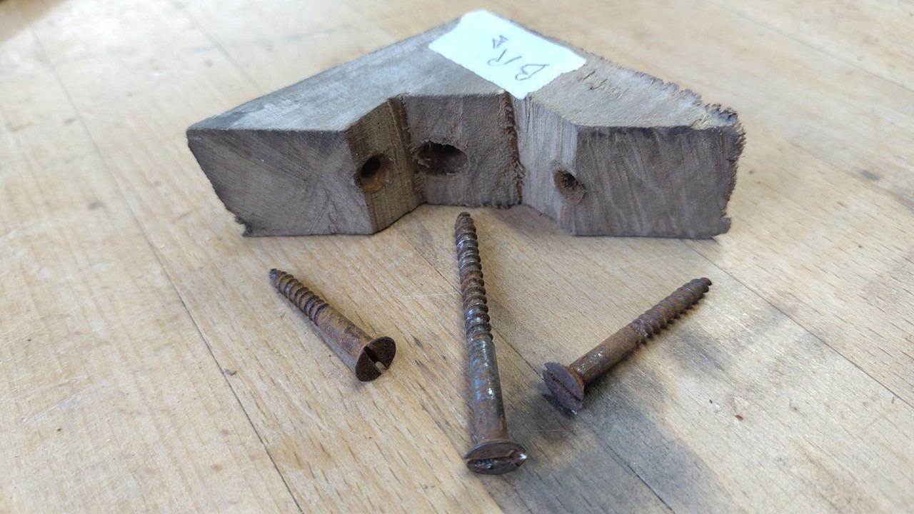Voici un renfort vu de plus près, avec ses vis. Ce qui est surprenant, c'est que sur la chaise en question, il n'y avait que trois renforts comme celui-ci. Le quatrième n'était qu'un triangle de bois collé et cloué. Après l'avoir retiré, je ne vois pas les trous que les vis auraient laissés dans la ceinture. Après, c'est vrai que le bois n'est pas en super état, les trous sont peut-être juste cachés.