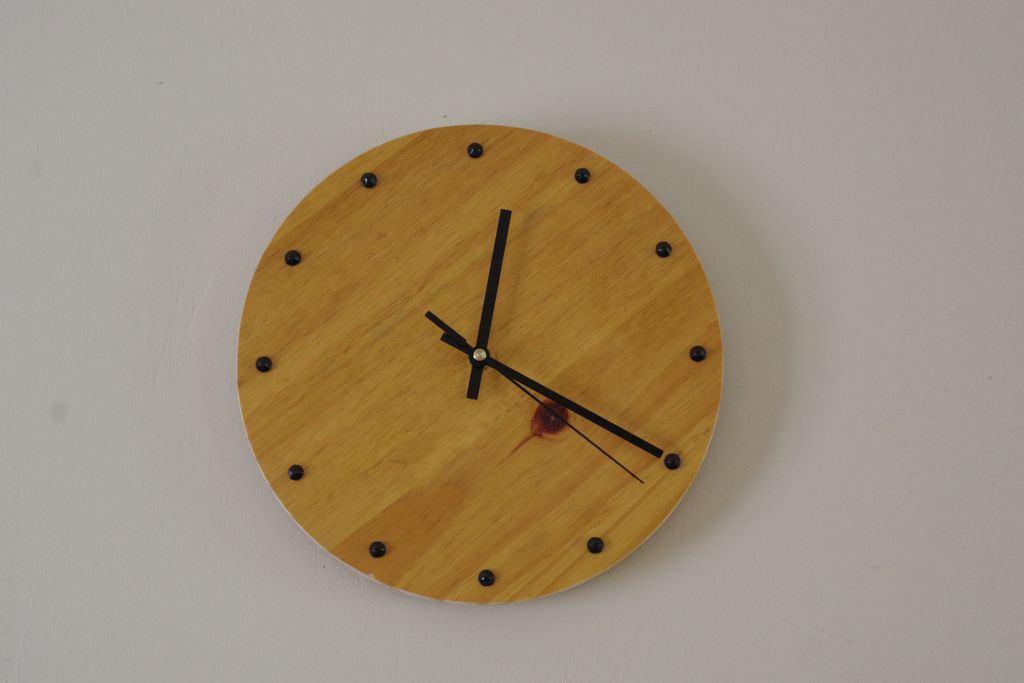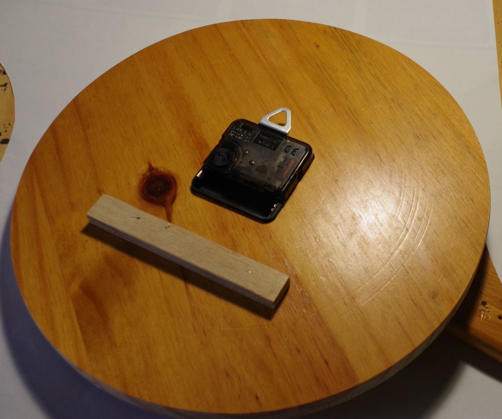 Une pendule, à partir d'un morceau d'une petite table que j'avais fait à mes débuts, un mécanisme acheté sur alie... arrivé avec les aiguilles un peu tordues, et 12 vieux clous repeints en noir; Découpe du rond à la défonceuse avec un compas, perçage du trou pour le mécanisme à la défonceuse + bague à copier et gabarit ajustable, préperçage pour les clous qui ont été enfoncés en utilisant ma perceuse à colonne comme presse, pour éviter d'abimer la peinture, et une petite cale pour qu'elle reste à plat.