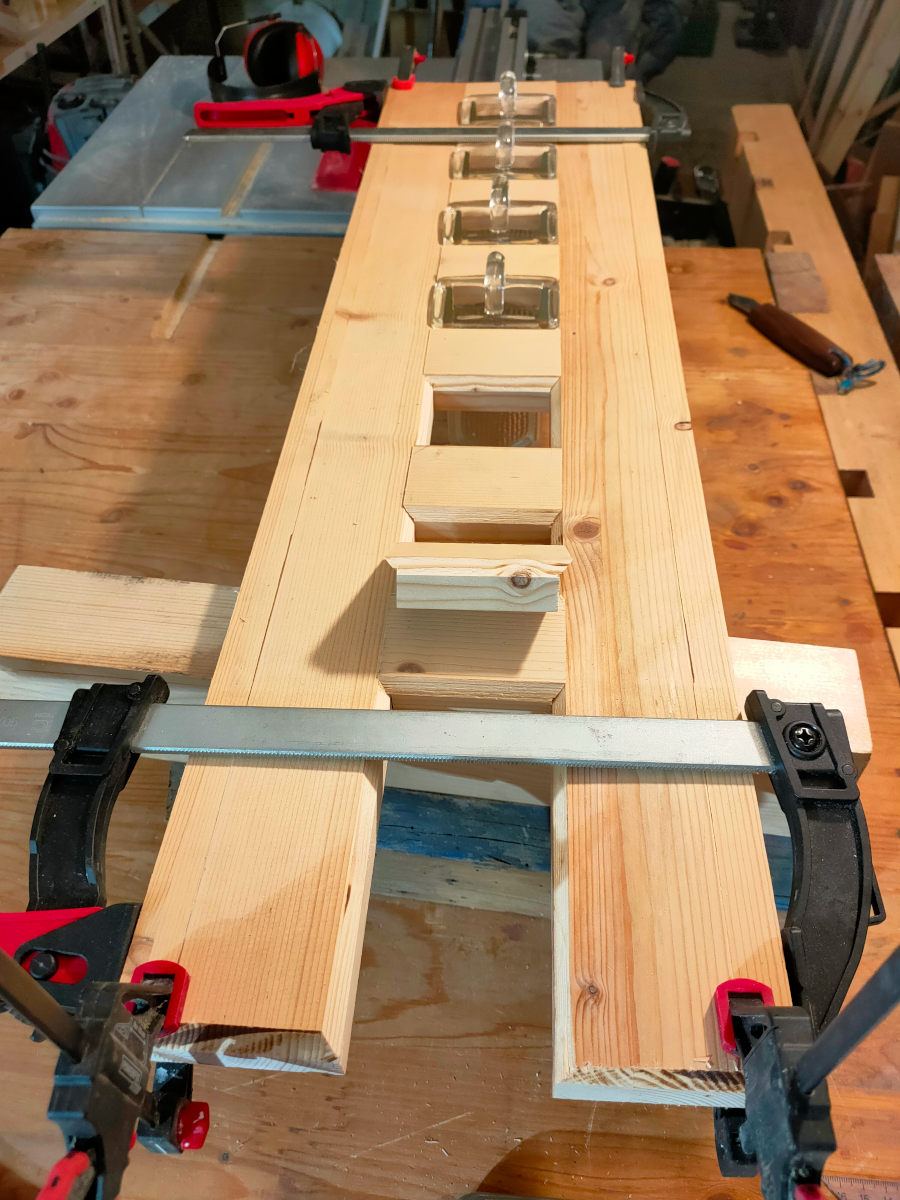 Au départ je voulais mettre du lamello mais avec l'angle sortant des traverses je ne peux pas positionner la machine donc j'ai opté pour des tourillons.