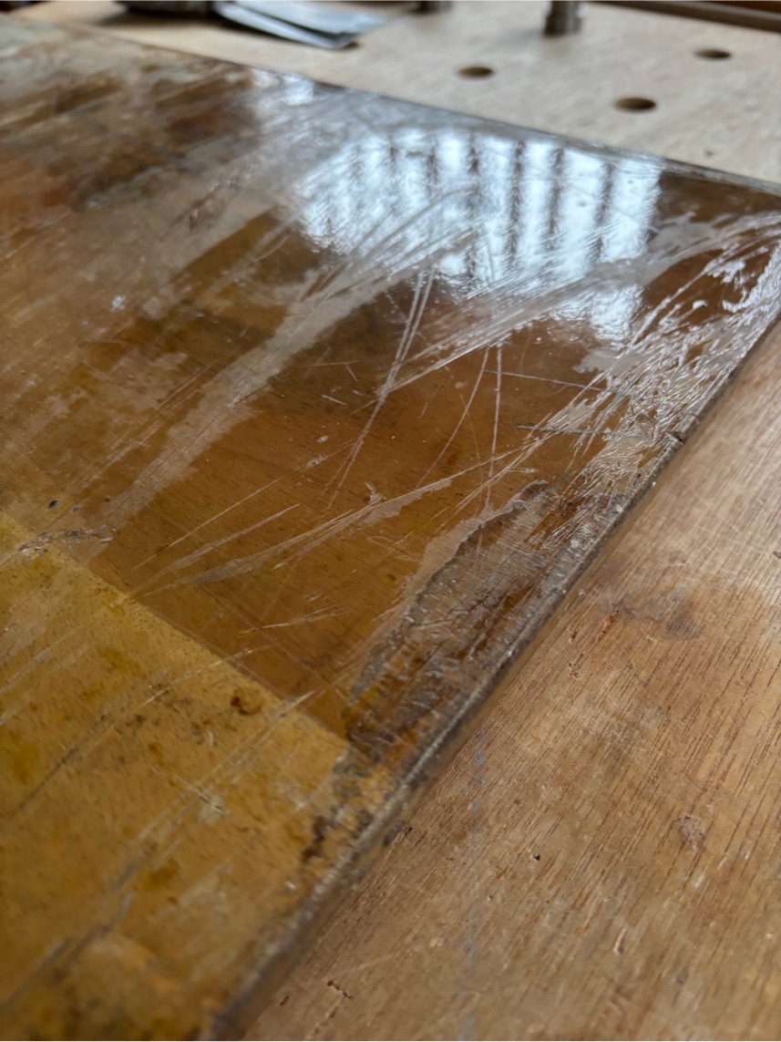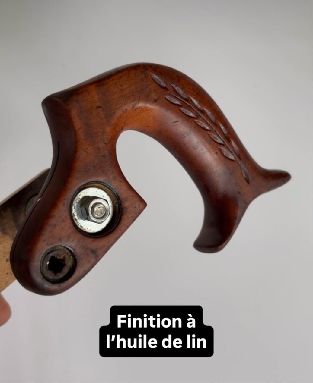 Savon noir, alcool à 90 et léger ponçage (pour retirer les résidus de vernis) et finition à l’huile de lin. La lame est dans un bain de vinaigre… on verra demain.