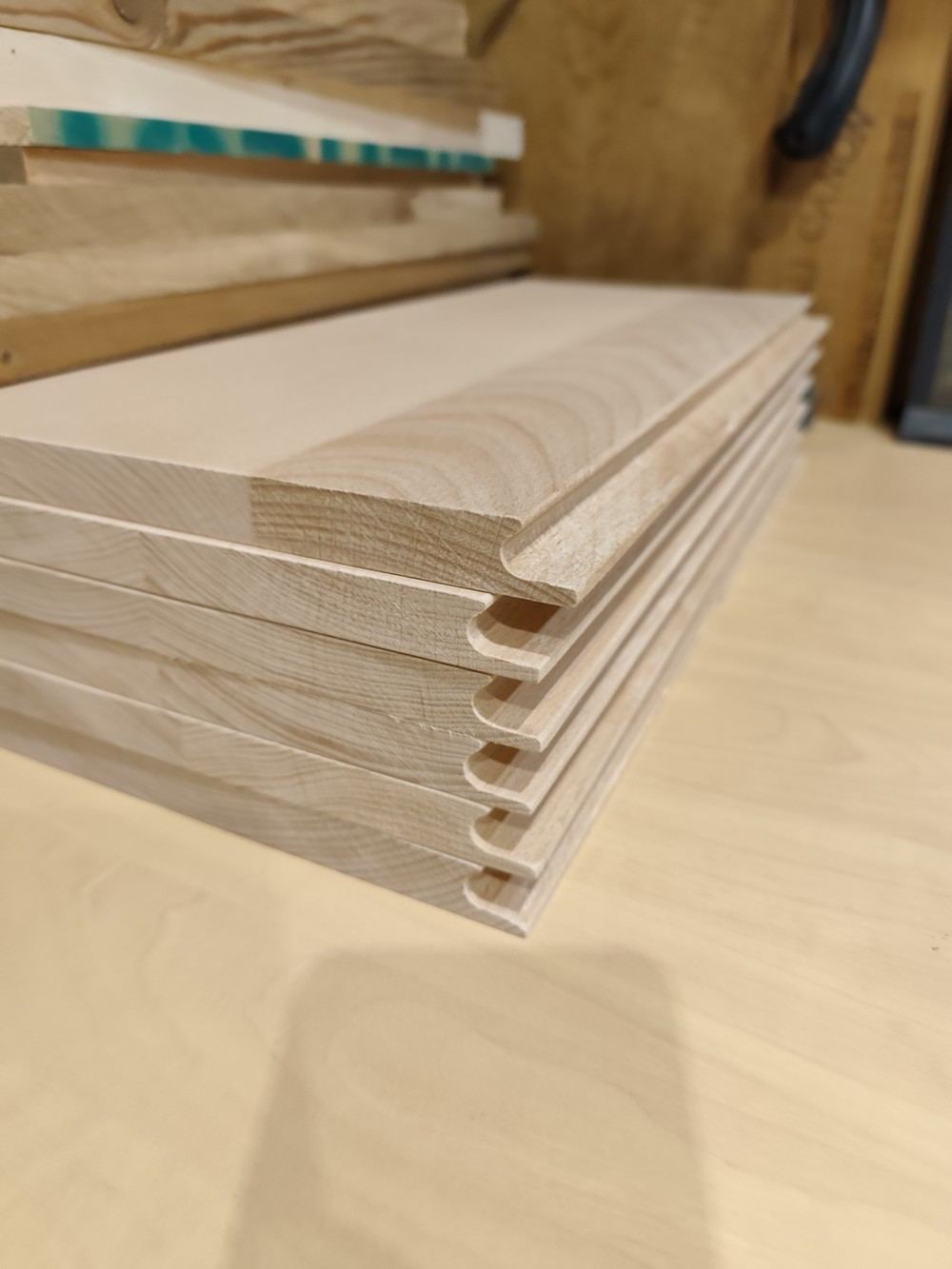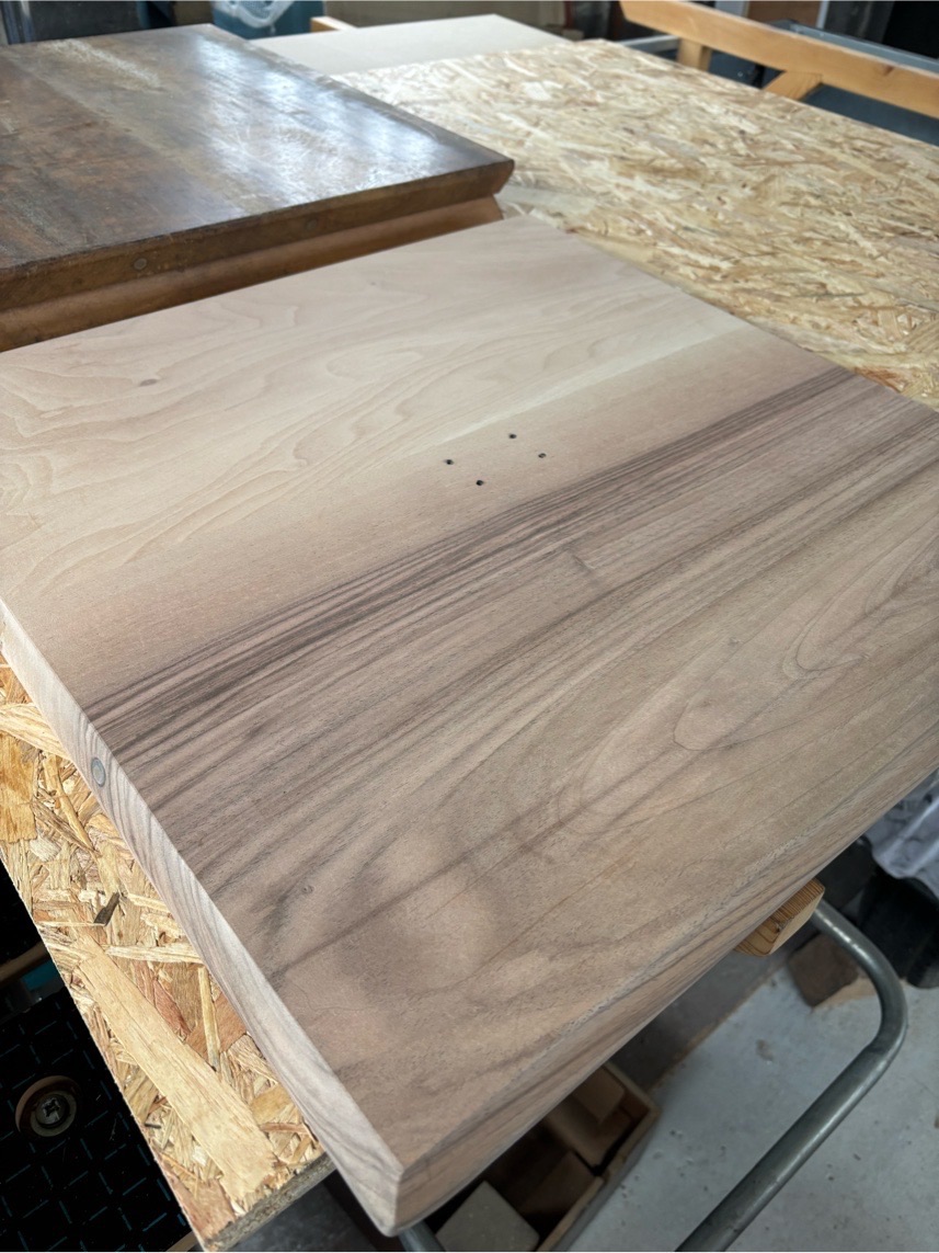 Ca m'a rappelé, que j'avais 6 façades de tiroir rabotées qui attendaient d'être coupées à leur taille définitive + usinage des poignées.