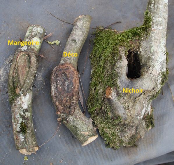 Donc, après abattage uniquement et mis de côté les petits trous, bosses diverses, les anamorphoses (mal formations) et coups de foudre, je passe à la sculpture de divers objets : nichoirs ou mangeoires pour oiseaux, champignons, personnages du Petit Monde.