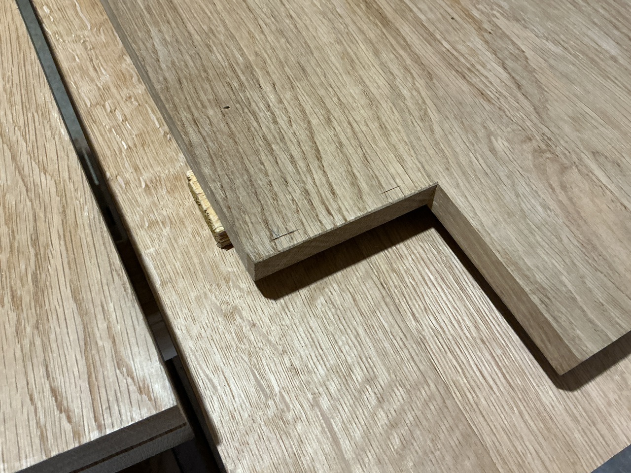 (Les petites marques sont faites avec la guimbarde (ou le trusquin Veritas, qui est pratique pour ça), elles me permettent de reporter la profondeur de l’entaille et de voir quand j’assemble si je suis totalement rentré). Un petit coup de rabot pour enlever quelques centièmes et c’est un match parfait!