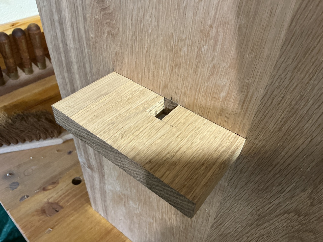 Je ne sais pas si on voit sur la photo, mais j’ai reporté l’angle des clés pour que les forces soient sur l’ensemble de la mortaise et pas uniquement sur la l’arrête haute.