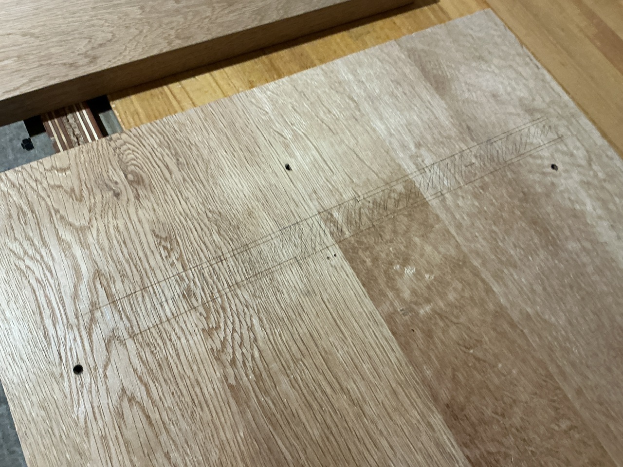 (Les petites marques sont faites avec la guimbarde (ou le trusquin Veritas, qui est pratique pour ça), elles me permettent de reporter la profondeur de l’entaille et de voir quand j’assemble si je suis totalement rentré).(...)