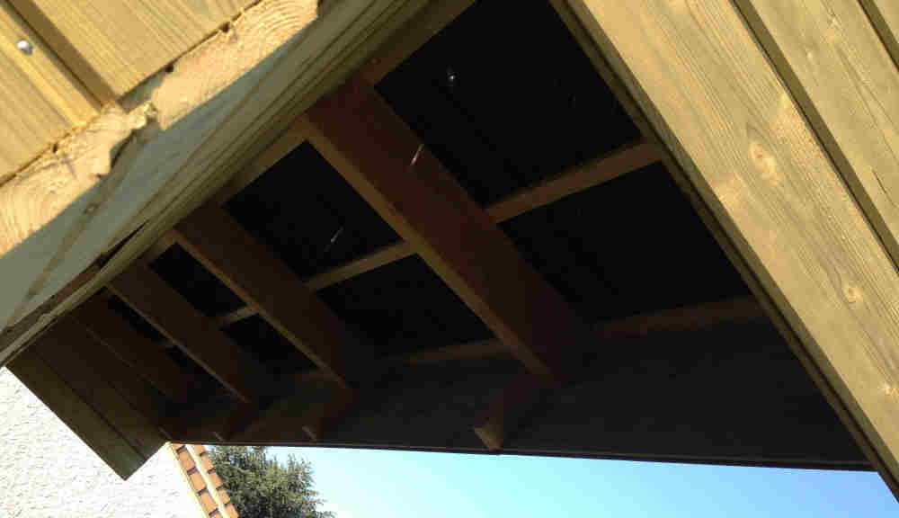 Pour ce qui est du toit j'ai posé du shingles (lame ondulée bitumée) facile à poser et pas très cher (9€ la plaque de 200x95cm)