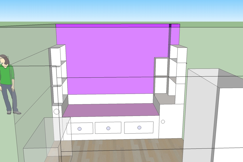 Voilà une ébauche du projet: Concernant le montage je pense partir sur un assemblage par vis cachés, le temps risquant de manquer pour faire du tourillon collage, et puis je pense fixer une bonne partie des planches au mur.