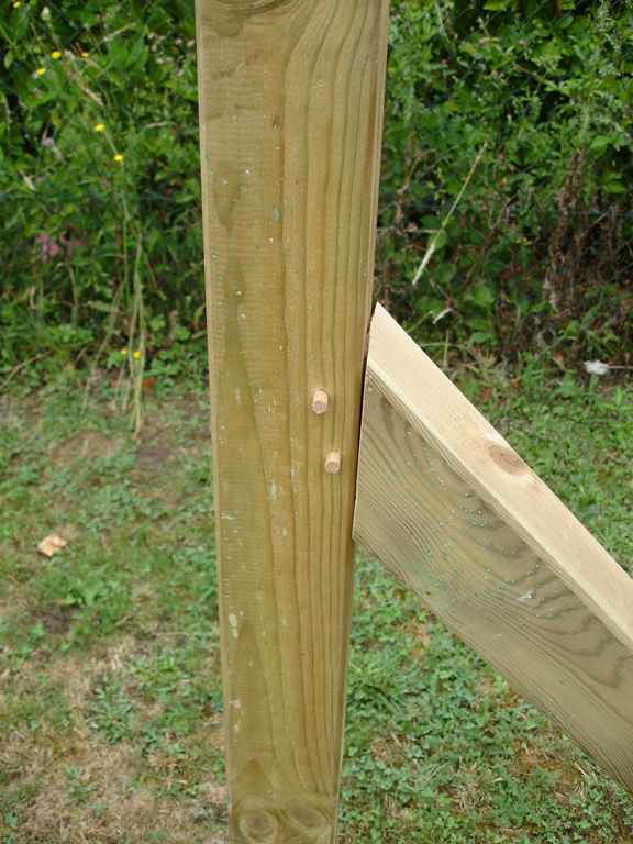 Le bois est du pin autoclave en section 90 et 70 mm, le tout chevillé avec des tourillons en hêtre de section 8 mm