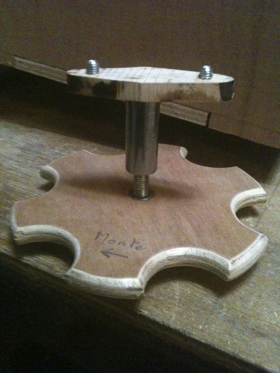 La vis avec la molette elle vient s'emboiter dans un trou d'une "clavette" qui elle même s'emboite dans des lumières réalisées dans les flancs du support de plan de travail de l'appareil (j'espère être compréhensible).