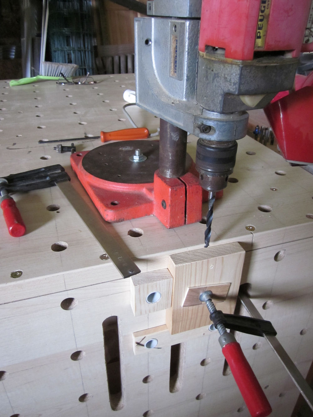 tout d'abord, l'installation de la perceuse à colonne, fixée dans la rainure par un boulon traversant la table et le mandrin sur sa face arrière : ensuite, positionnement et serrage de la pièce à percer, puis de la perceuse en la faisant coulisser dans sa rainure : même chose avec une plus grande pièce de bois : même chose avec une pièce plutôt encombrante : bon eh bien, la j'ai un truc à terminer à l'atelier, mais je reviendrais pour l'installation du gabarit "santé"