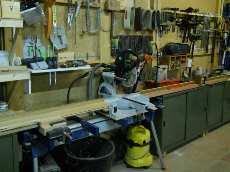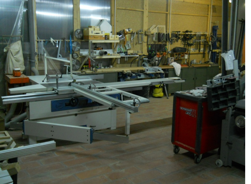 en entrant, sur la gauche de mon atelier qui fait 80m2, une toupie avec ses rallonges de table maisons et son entraîneur. ensuite, une toupie-scie minimax ST4 élite une scie à onglet radiale Kapex