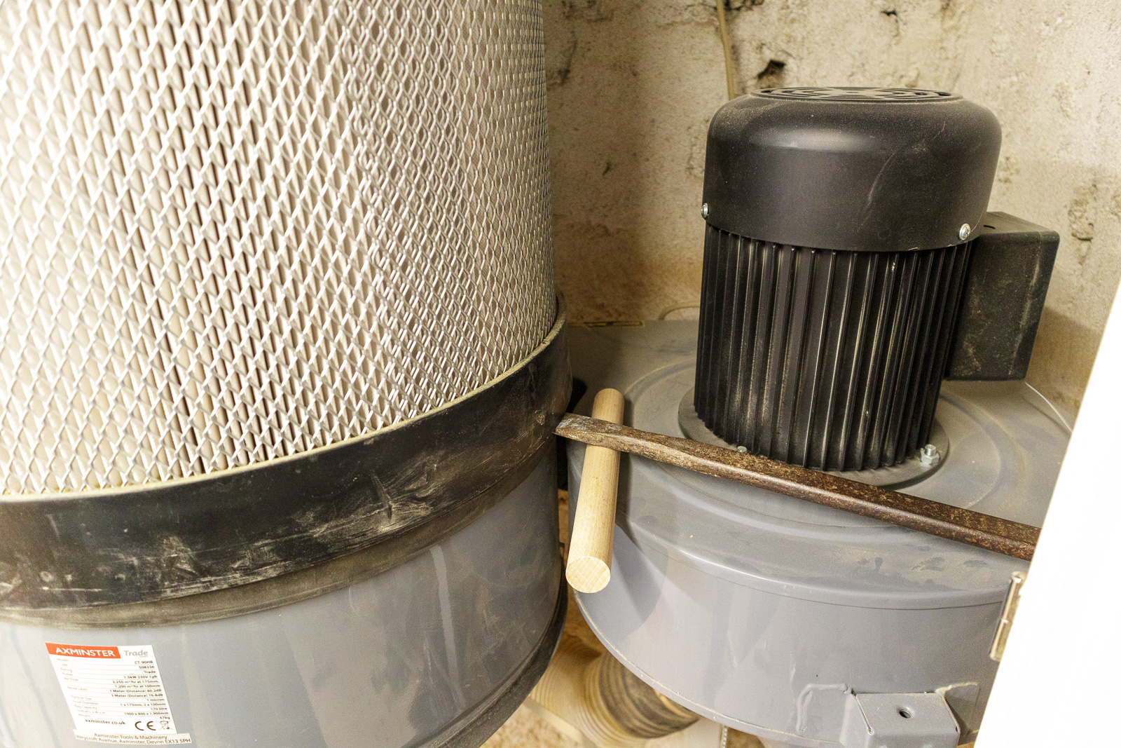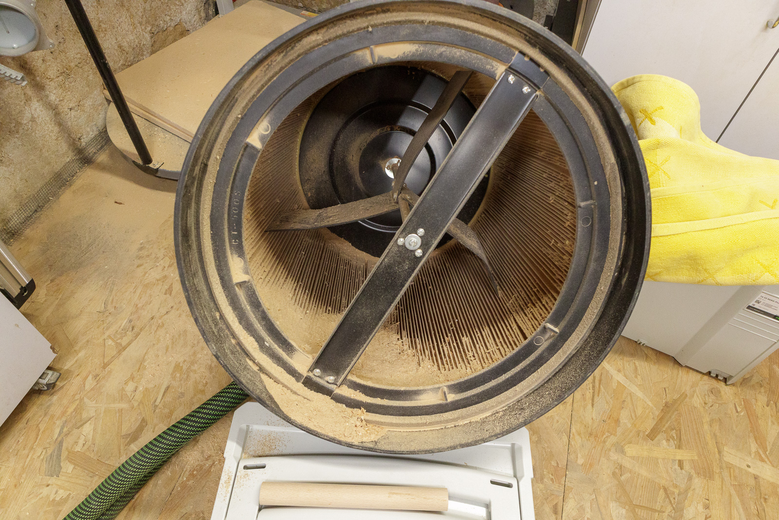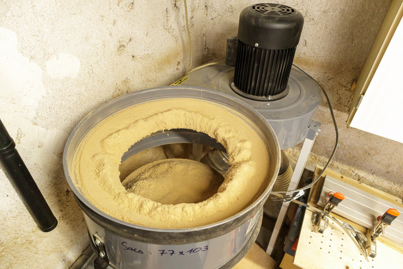 Je ne l'utilise pas seulement sur la dégau-rabo, il est aussi relié à ma scie à format, à ma scie à ruban, et à la table de défonceuse. Donc il n'aspire pas que des copeaux, mais aussi pas mal de poussières fines. De temps en temps, Je démonte la cartouche pour nettoyer, ce que j'ai fait ce matin.