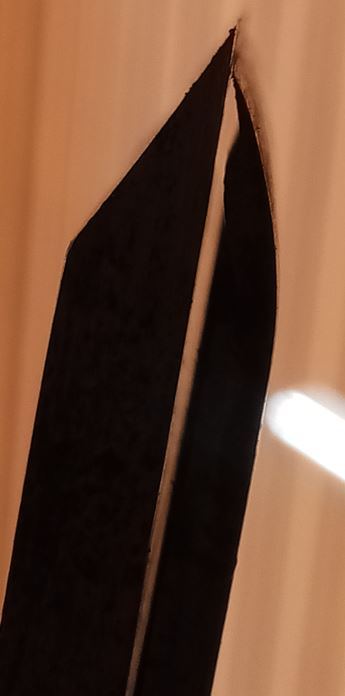 il fallait refaire toute la ligne et enlever un gros 2/10 à droite .. juste 2 coups de lime au départ , et ensuite abrasif grain 180 sur chute de mélaminé avec recherche de l'angle ; cette fois j'ai marqué au feutre le biseau à plusieurs reprises, et contrôle régulier en posant l'angle d'une equerre