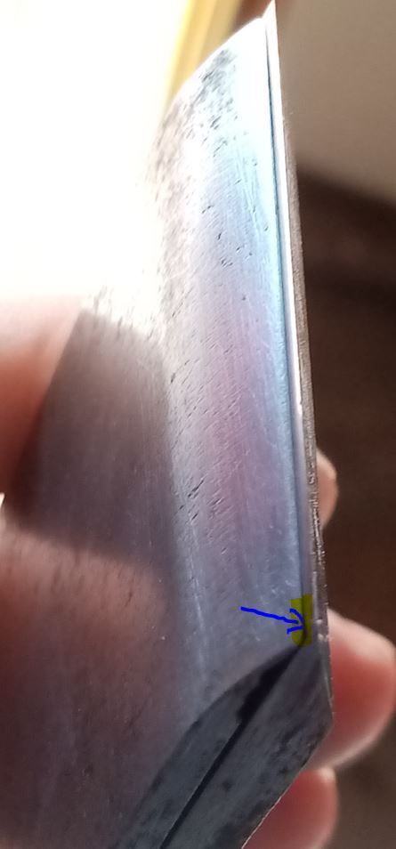 Oui le trait bleu doit se prolonger jusqu'à la pointe , par contre si il fait 2 ou 3 mm ça suffit , on aura bien comme unique contact avec le fer une ligne horizontale correspondant à la pointe du biseau. De profil comme sur la photo on aurait juste un point en contact.
