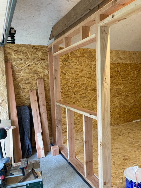 Et la cloison apparut : Comme d'hab, c'est une première pour moi, ça me stresse parce-que j'ai toujours l'impression que c'est pas droit. Mais bon j'ai cru comprendre qu'on n'est pas non plus sur de l'ébénisterie et que le pinaillage est contre-productif. Donc j'essaye d'être détendu du millimètre