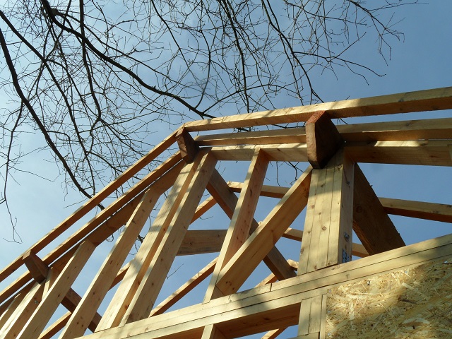 Sur les rives latérales, j'ai un débord de 25 cms. Il y a donc deux chevrons rapprochés à cet endoit. J'ai aussi coupé les coins des pannes pour faire plus joli (mais je n'ai pas pensé au fait que j'aurais pu tout refermer avec des voliges; on verra plus tard pour la finition).