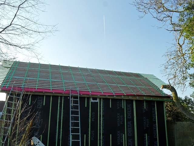 La pose de la sous-toiture est assez classique. On déroule une bande de 1m50 de large et de 8m10 de long (j'ai une longueur de toît de 7m90) que l'on fixe dans un premier temps avec des agraffes. Il ventait fort lors de la pose du premier versant, ce qui fait que c'était assez difficile de bien tendre la sous-toiture qui avait tendance à s'envoler dans tous les sens. Ensuite, pose de contre-lattes (18 mm d'épaisseur) sur les chevrons sur la largeur de la bande de la sous-toiture en laissant 10-15 cms de libre pour le recouvrement de la bande suivante. Les bandes sont raccordées entre-elles avec du Tyvex (papier collant simple face qui colle bien).