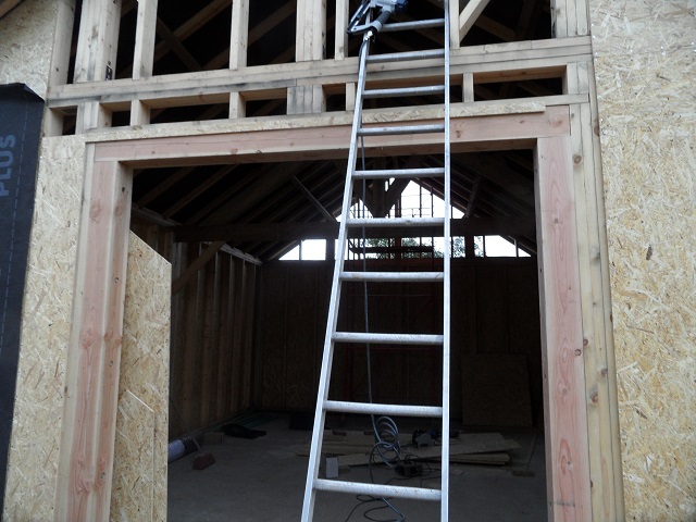 Tout d'abord, j'ai posé les dormants et linteau de la porte d'entrée. C'est du douglas 150*150, déjà une fameuse section. Je ne sais pas quelle est la bonne procédure, mais avac le mur déjà en place, ce fut un peu 'sport'. Sans doute, aurait-il fallu que je mette les montant au-dessus de la porte une fois le montant déjà en place. Mais bon, ce n'est pas le cas, il faut improviser comme d'habitude. Une fois les montants et domant coupés à bonne longueur (jeu de 2-3 mm seulement), je place le linteau avec étançon (j'en avais qu'un seul), serre-joints, corde,... ensuite, on glisse les montant en dessous, ceux-ci restant toujours verticaux. J'ai essayé en les redressant, mais le jeu ne le permettait pas. Finalement, le résultat n'est pas si mal. J'ai toujours aimé ces grosses sections de douglas.