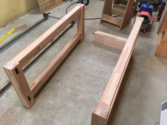 Usinage des pieds: Un coup de ponçage: Et on peut passer à l'assemblage: Je l'ai collée à l'envers pour pouvoir m'occuper des pieds ensuite. Vu les sections, je pense que ça devra être solide.