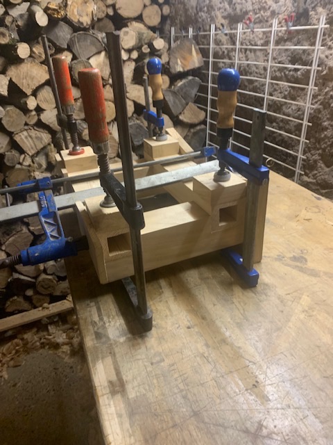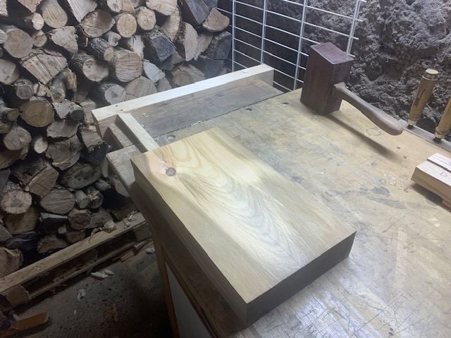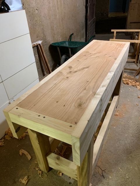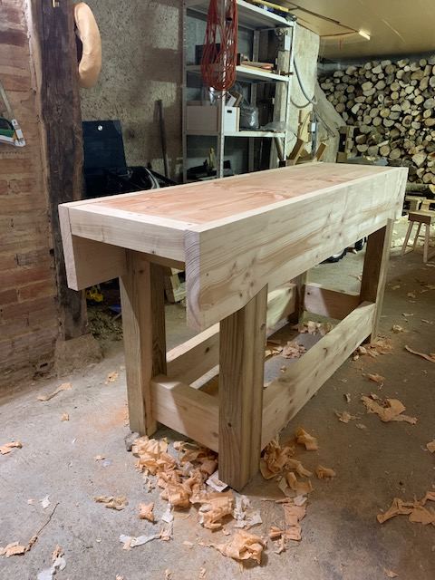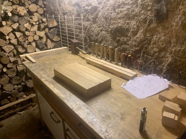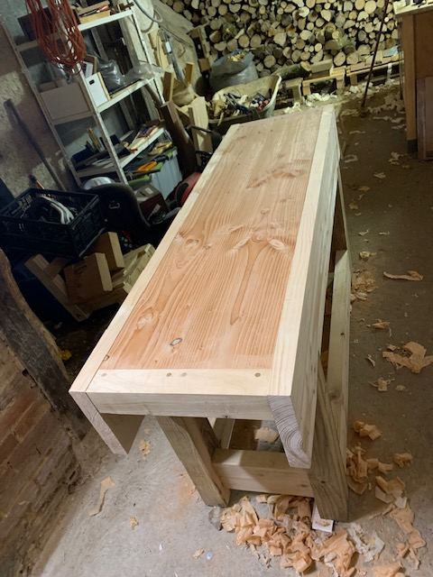 Les mortaises dans le tablier ne sont toujours pas faites, je préfère attendre d'être seul (mon fils de 3 ans vient souvent avec moi à l'atelier et je ne peux pas me concentrer avec lui), d'avoir le temps et d'être en forme. J'ai remarqué que travailler fatigué ne donne jamais de bons résultats souvent par manque de lucidité et de patience.