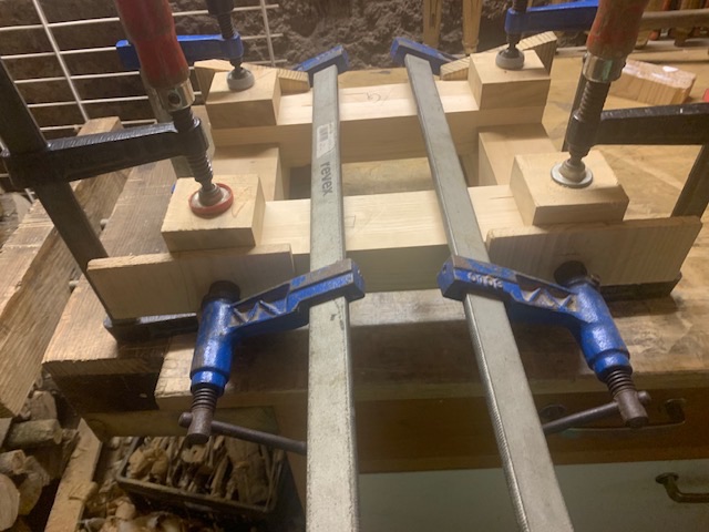 Le système de glissières de la presse de devant est enfin à la colle. J’ai beaucoup hésité et j’ai dû refaire deux pièces en azobé qui avaient vrillé. J’avais envisagé de faire une presse de bout parce que je rabote beaucoup mais je me demande si c’est une bonne idée. Oui, c’est élégant mais en fait une « griffe » serait sûrement plus pratique… qu’en pensez-vous ?