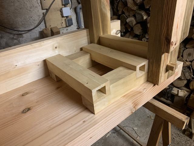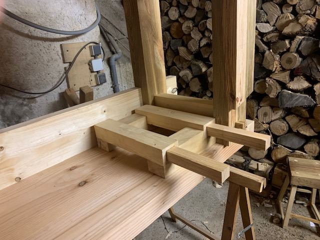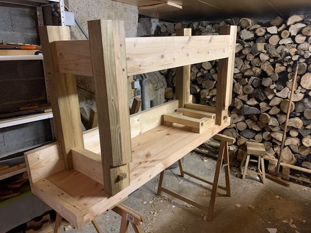 Pas de photos aujourd'hui mais j'ai avancé un peu grâce à ma chère et tendre: j'ai mis l'établi à l'envers sur des tréteaux avec son aide ce qui m'a permis de tracer les mortaises dans le tablier de devant pour faire passer les coulisses de la presse.