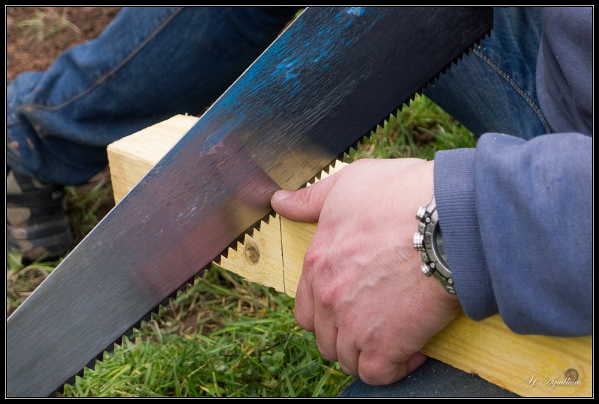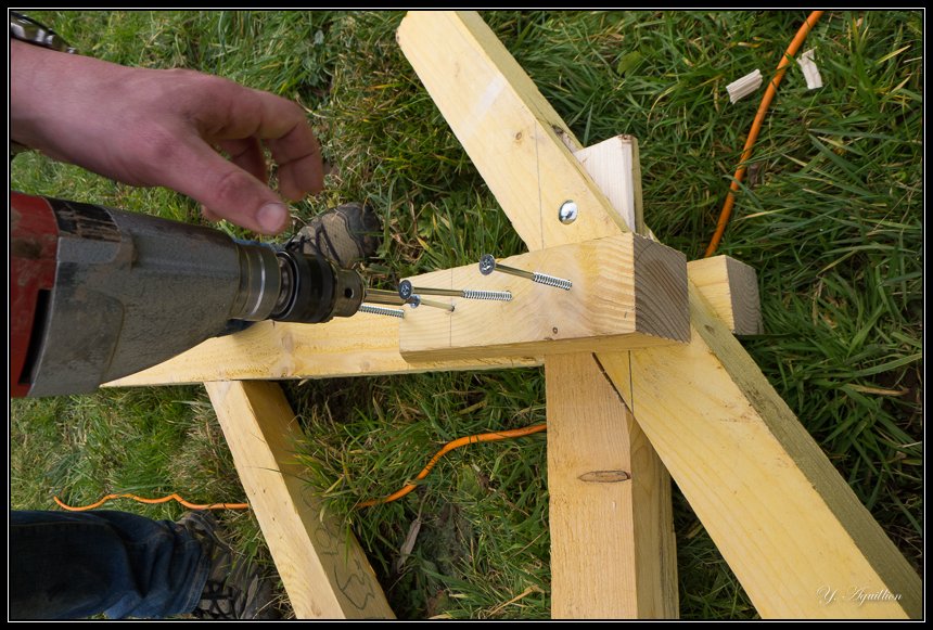 Mise à longueur des pieds (pas tous à la même longueur, pour compenser les 10% de pente du terrain) :