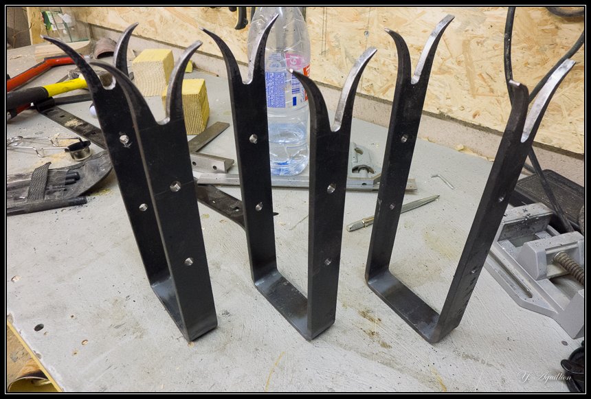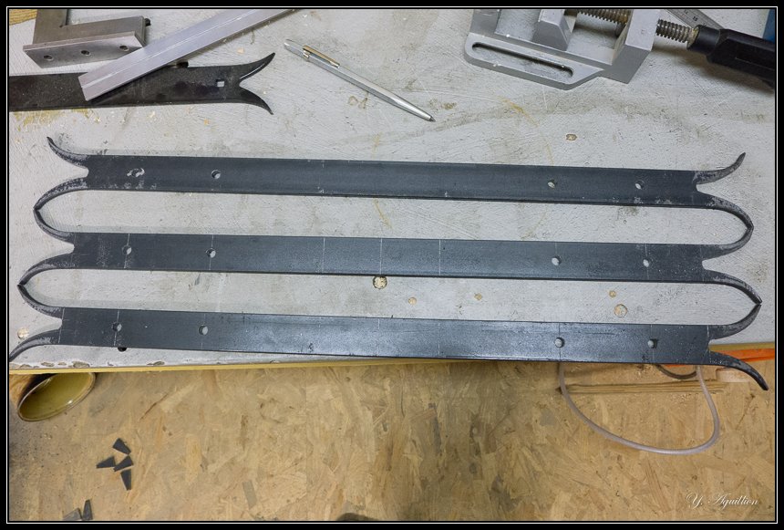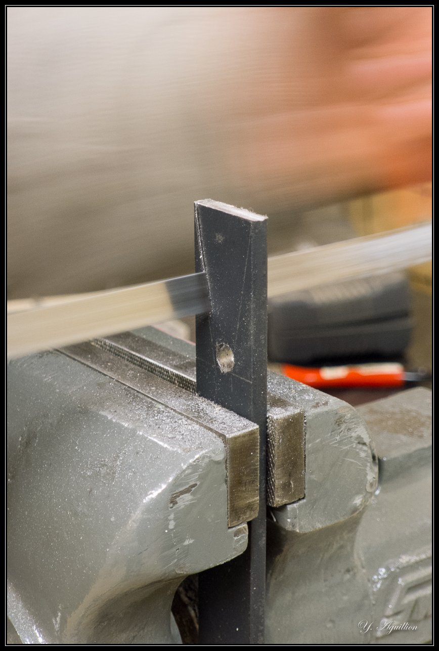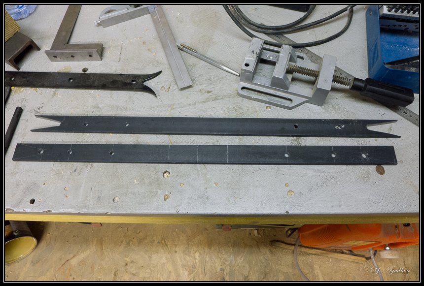 Quelques hectolitres de copeaux plus tard, j'ai décidé de fabriquer les pièces métalliques qui servent à maintenir les poinçons centrés sur les entraits, pour ce faire, j'ai acheté 2 mètres de fer plat de 6 mm x 30 mm, que j'ai sectionné en 3 morceau de 60 cm (et une ch'tite chute de 20 cm) :
