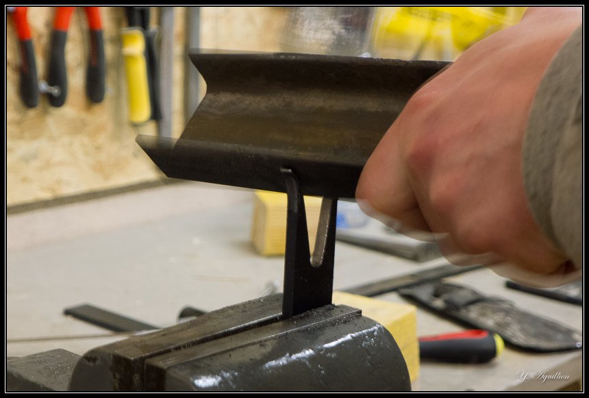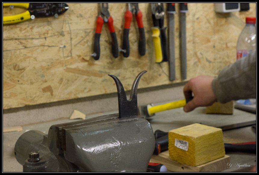 Ensuite j'esquisse les queues de carpe avec un morceau de profilé et un marteau :