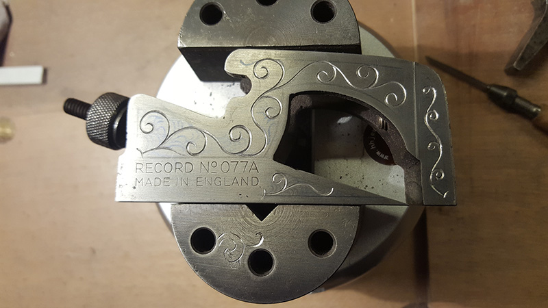 Alors oui, c'est la même technique que celle utilisée pour graver les fusils, et non le boulet de graveur n'est pas fixé sur mon établi.