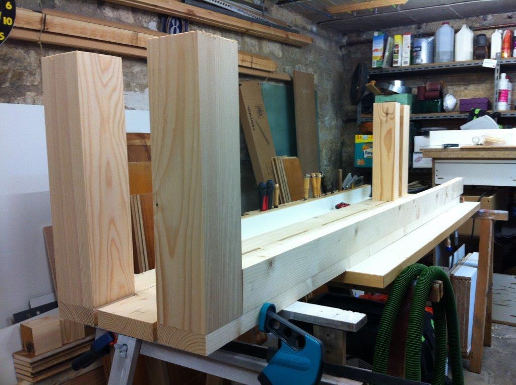 et les pieds sont assemblés reste à relier les deux montages par les traverses longues et là SamuelM diffuse son gabarit de compétition qui fait trop envie. Non non, je vous rassure je ne l'ai pas fait mais j'avais dans un coin de mon atelier une sorte de prémisse de l'idée géniale du Maître et me voilà à jouer dans la coure des grands avec mon truc horrible, je vous montre (ben oui on se dit tout)