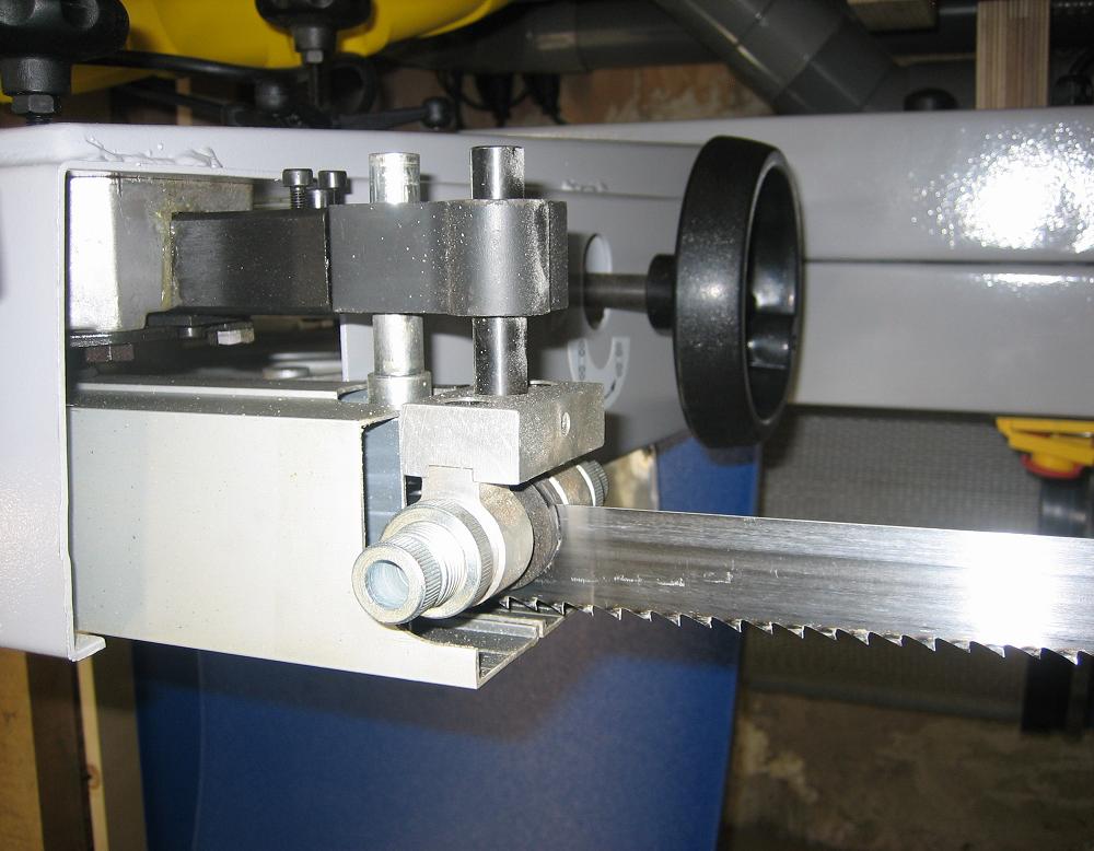 mais conclusions, pas de soucie au niveau du jeu dans la roue superieur car une fois mise en tension le jeu est minime et n'occasionne aucun souci de bon fonctionnement, pour le guide sur table la lecture des graduation sur le profil est faciliter par deux loupes une de chaque cote, le serrage de ce guide se fait par l'intermediaire de la poigner noir a l'avant qui agit sur le roulement arriere donc deux point de serrage (tres efficaces) .