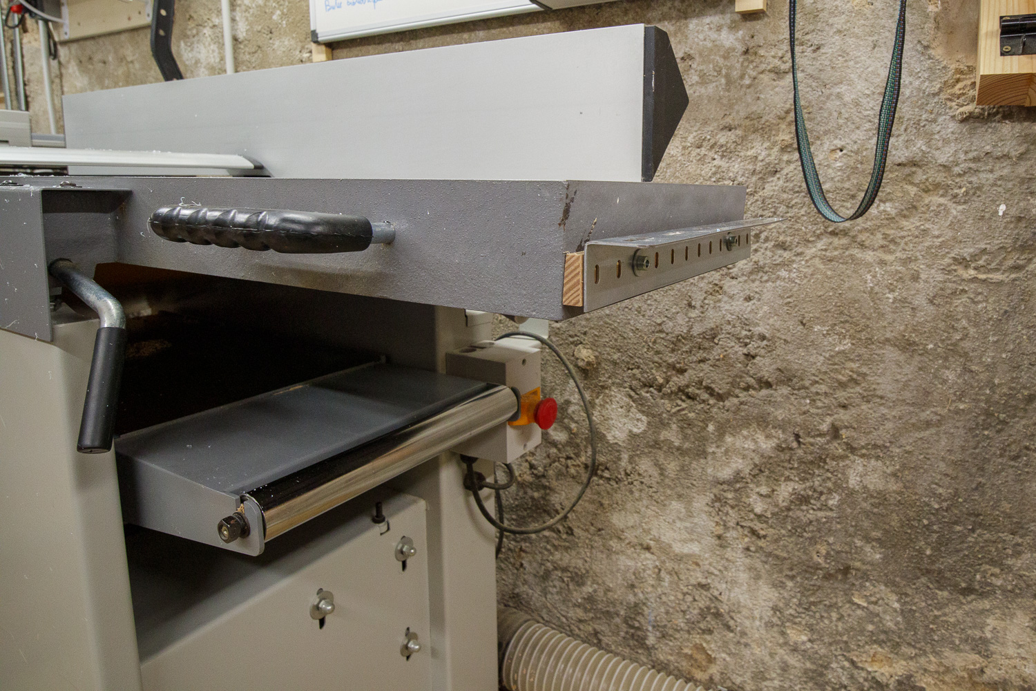 Pour le dégauchissage de pièces longues, j'ai fabriqué des rallonges, que je stocke derrière la table de défonceuse. Ça me permet, sans rien déplacer d'autre, de dégauchir des pièces jusqu'à 2m10. Si j'ai besoin de plus long, je peux aller jusqu'à 2m50 en reculant la dégau-rabo vers le fond de l'atelier, mais c'est rare et heureusement, car ça nécessite un peu de manutention.