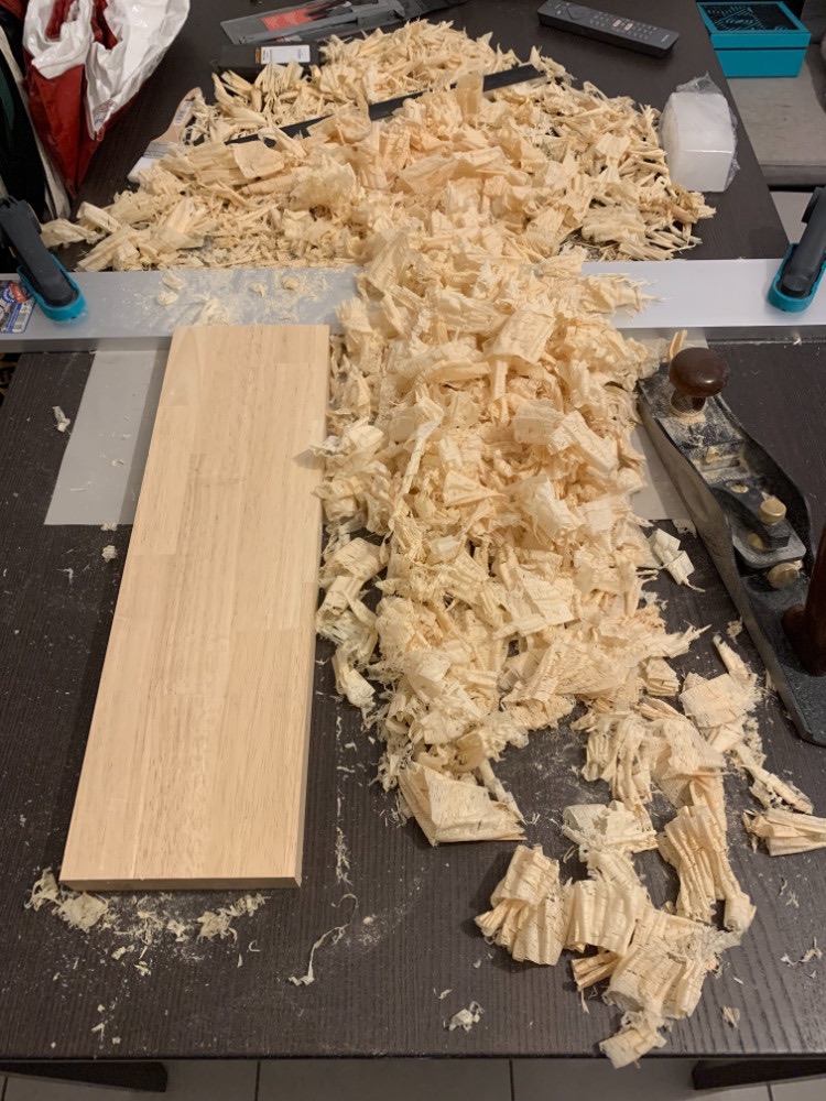 Au final beaucoup de copeaux (j'ai dû abaisser certaines planches sur 2~3mm d'épaisseur), pas mal d'erreur de rabotage : fer à 25° sur un rabot à angle faible, lumière trop ouverte, passe trop importante et parfois à contre-fils... Du coup j'ai eu quelques arrachements... J'ai fini par réserver le fer à 25° pour dégrossir et pour le recalage en "maitrisant" un peu mieux le réglage de la lumière. Pour le reste et la "finition", j'avais eu la bonne idée de prendre un fer à 50°. Ça fait les bras, mais plus de soucis d'arrachement et un touché suffisamment lisse pour moi et pour un établi.