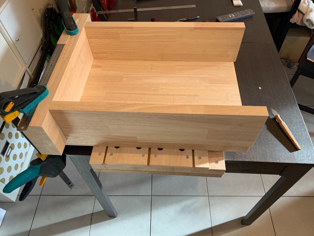 On peut voir quelques légers soucis d'équerrage. Mais en grand débutant, j'en suis resté à "le mieux est l'ennemi du bien" et j'aurais tendance à penser qu'une fois tout vissé, ça n'aura pas d'effet négatif sur l'établi.