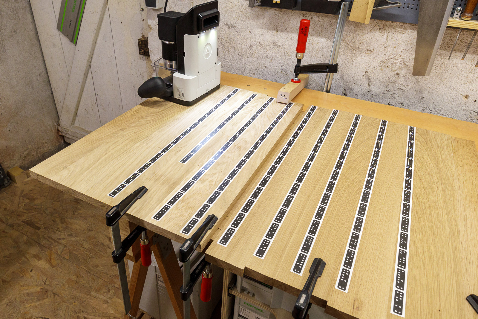 Les plus observateurs d'entre vous auront remarqué une petite encoche au niveau des trous des dominos. En effet, je n'ai pas usiné les trous à la bonne dimension, et je vais devoir raboter très légèrement mes dominos en largeur, ce qui va supprimer le jour qui permet à la colle de s'évacuer. Pour pallier ceci, j'ai fait une petite encoche sous chaque domino.