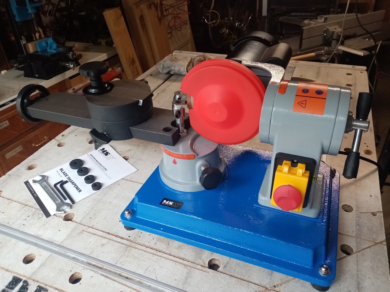 Quatre pions de centrage de lame (30/25/22/20), et des clés de qualité correcte pour l'assemblage dont une clé Allen raccourcie à bon escient. Le manuel est sommaire même s'il ne s'agit pas d'une simple feuille comme chez Vevor… Aucune instruction de montage (après, ce n'est pas une fusée de la Nasa non plus…) et de simples instructions d'utilisation et de sécurité. Aucune pièce en alu, que de la fonte d'acier et aucun jeu une fois le montage effectué.