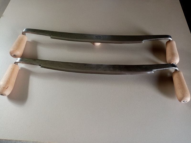 alors oui en métal je n'y connais pas grand chose.... et en tournage je suis très débutant... alors quand j'avais acheté le dernier lot de plane (un lot vraiment pas cher, mais alors dans un état très mauvais ...outils très anciens ayant appartenus à un vrai charron,) j'avais bien vu et conscient que seules 3 sur les 9 du lot possédaient encore des poignées viables, que j'avais donc réparé.. et puis donc pour les 6 autres faires les manches, oui, mais les emmancher c'est plus compliqué .. allez je vais me lancer ..! sur certaines , en fonction de la forme de la soie le matage est possible ou indispensable et sur d'autres non .. avant ces deux grandes, je l'avais réalisé sur un modèle classique Peugeot mais sans bouterolle, donc petit marteau et l'aide d'un chasse goupille (ce qui est le plus embêtant c'est le maintien et l'appui du manche, car en frappant cela a nettement tendance à faire remonter le manche pourtant enfoncé en force précedemment..!! c'est la phase finale la plus stressante, énervante..!!!