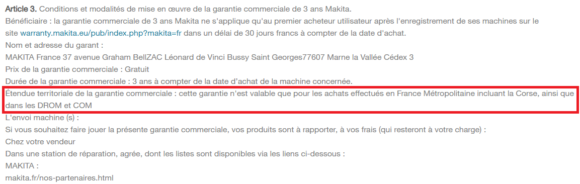 Je ne suis pas sur que cette clause, si elle existe, ne soit pas illégale vis à vis des lois européennes.Il semblerait que l'extension de garantie Makita soit strictement réservée aux produits achetés auprès d'un revendeur établi en France et accompagnés d'une facture émise sur le territoire français.