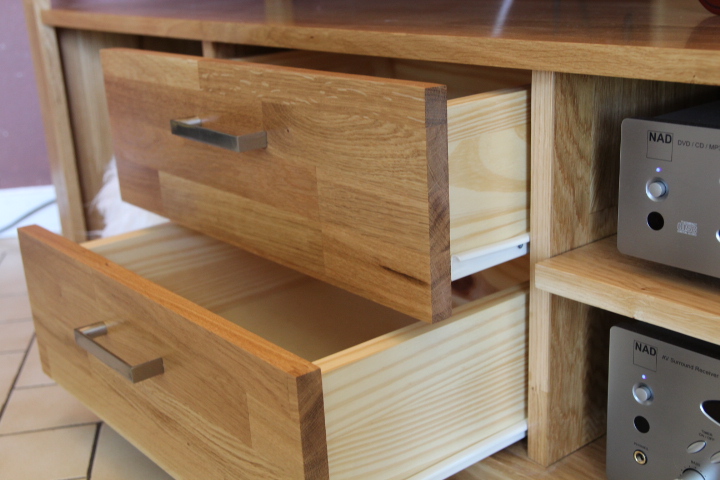 Pour tes câbles si il te reste un peu de bois faire faire une sorte de goulotte de la hauteur entre tes 2 plateaux ?posé centré sur tes tiroir tu peut même pousser cette goulotte contre mur qui te permet de passer les fils TV vers chaines