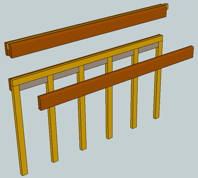 Merci du conseil. Le problème que je vois, comme avec les mortaises, c'est en bas. ça va stagner dans la rigole.jft68 a écrit : Si tu n'as pas le moyen de faire des mortaises, tu peux tricher en insérant tes barreaux entre deux pièces horizontales qui les prendront en sandwich. Il suffira de combler les intervalles par des cales de la bonne longueur.