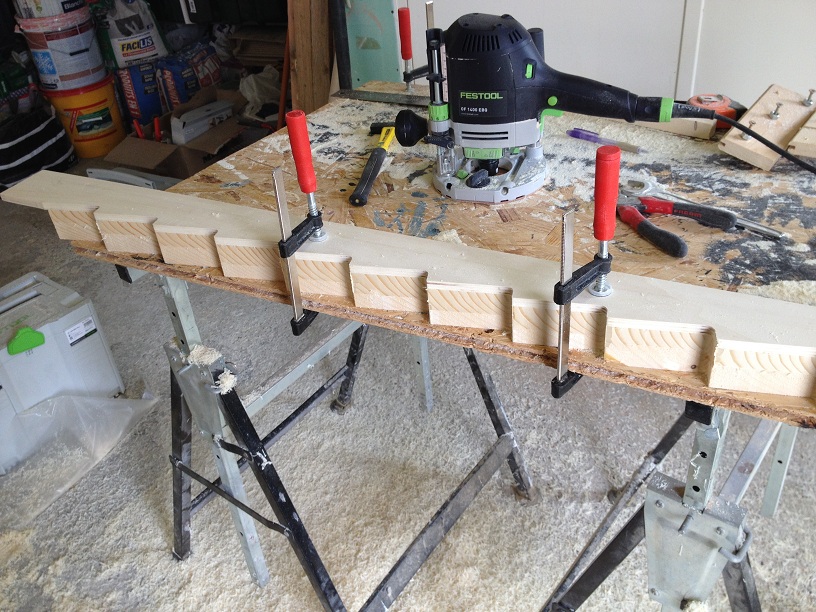 Réalisation des montants support des planches de toit, à l'aide de 2 gabarits et d'une fraise à copier série longue. Obligé de défoncer en 2 fois, de chaque coté de la pièce car le bois est trop épais et la fraise pas assez longue. Le plus compliqué est de positionner les 2 gabarits pour éviter tout décalage ...
