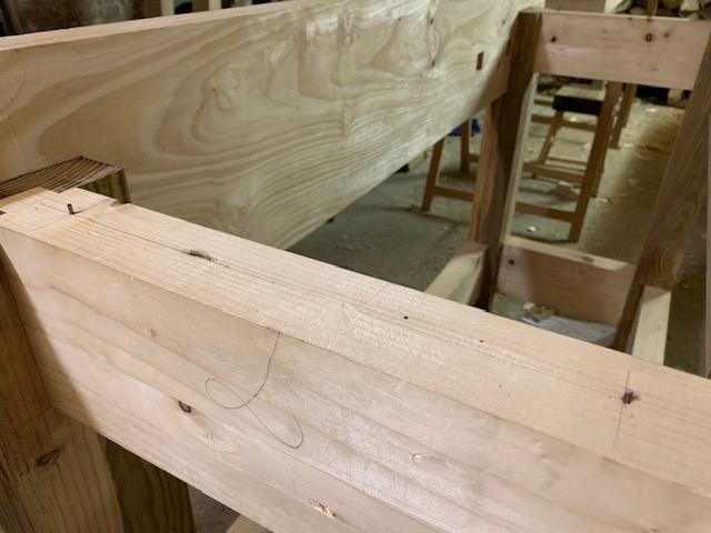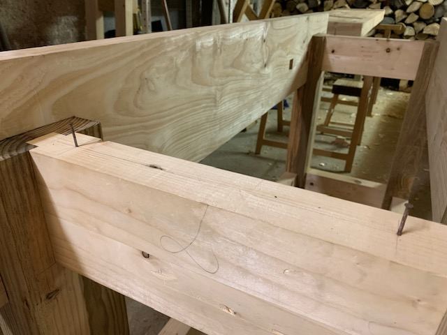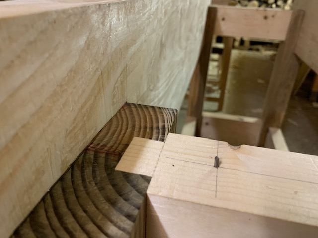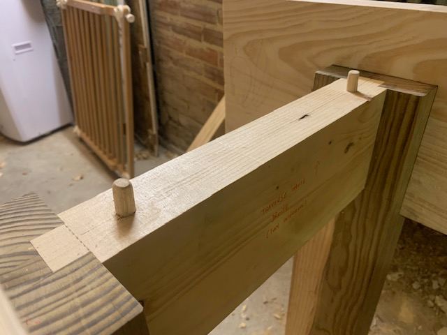 J'ai fixé le deuxième tablier (face avant) sur le piétement avec un faux-tenon traversant qui joue le rôle de clé grâce à un coin. Sur cette photo, l'établi est toujours tête en bas sur des tréteaux.