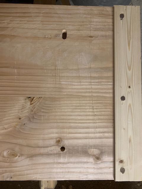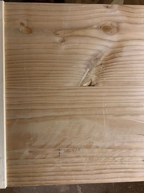 J'ai donc planté des clous sur les traverses qui supportent le plateau Je les ai coupés à 2-3mm Puis j'ai posé le plateau à sa place ce qui à marqué le dessous du plateau (j'aurais préféré être deux pour cette opération) J'ai utilisé un outil dont le nom m'échappe (une sorte de pointeau à 4 faces avec un manche) pour décaler mes perçages sous le plateau côté arrière J'ai percé à l'endroit des traces laissées par les clous et j'ai fini avec un ciseau pour finir le trou oblong qui, je l'espère, évitera que le plateau ne craque quand il se rétractera ou s'élargira Là, une vue des chevilles enfoncées et collées dans les traverses J'ai fait un montage à blanc, ça rentre sans forcer et sans jeu, content je suis. Voici comment ça se présente pour l'instant:
